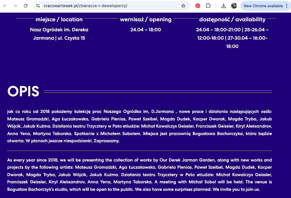 Alongside works by Mateusz Gromadzki, Paweł Szeibel, Magda Dudek, Kacper Dworak, Magda Tryba, Jakub Wójcik, and Jakub Kużma, as well as projects by Trzycztery Theatre and a meeting with Michał Sobol, this year’s program continues to expand the garden’s unique ecosystem.