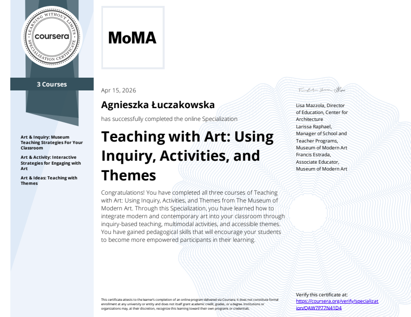 Today, I completed The Museum of Modern Art Teaching with Art: Using Inquiry, Activities, and Themes Specialization on Coursera focused on teaching with art. The program explored how modern and contemporary art can be used as a tool for learning across different subjects, using inquiry-based methods, activities, and thematic approaches.